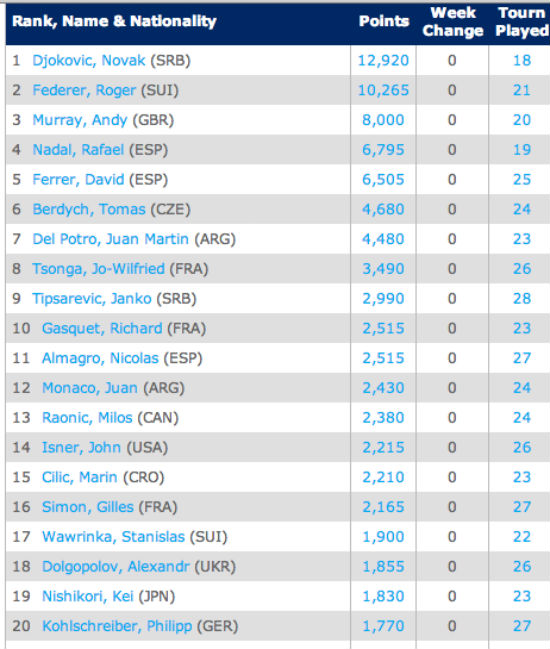1. Novak Djokovic (SRB) 12,920 1 – 13,630 Same position